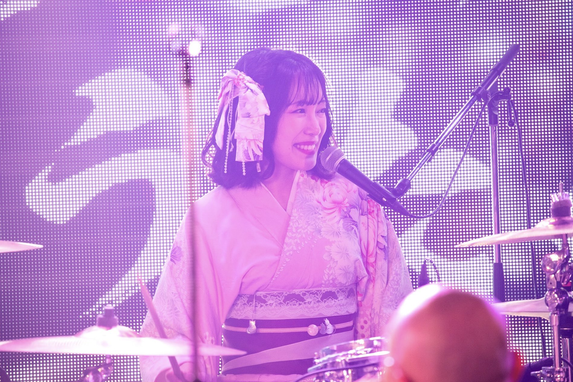 今回のワンマンライブでは、復帰するおがみおがに加え、留守の間バンドの屋台骨を支え続けてくれたサポートドラムの「遍路巡郎(へんろめぐろう)さん」。