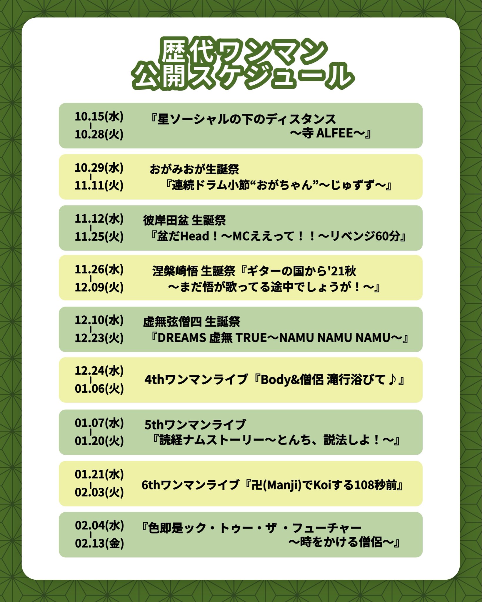 | ⑦ 1/7(水)〜1/20(火) | 『5thワンマンライブ「読経ナムストーリー〜こんにちは、説法しよ!〜」』 |